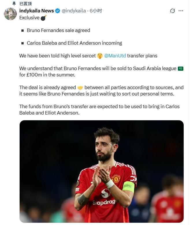 来自Indikaira News的独家消息透露,曼联已经与沙特联赛球队达成协议,以1亿英镑的价格出售曼联队长布鲁诺·费尔南德斯(又名B-Fee)。双方达成一致。指控 B 正在等待个人条件的处理。曼联预计将斥资签下巴勒瓦和埃利奥特。 Indykaila News,俗称“绿帽兄弟”,是一家知名的广播媒体。今年夏窗,我们报道了维尔茨等人的转会消息,并获得了高度评价。然而,戴绿帽子的说法往往被怀疑夸大事实,并流传大量假新闻。曼联是否会出售B费的问题还有待媒体进一步确认。不过,从目前的舆论状况来看,不少球迷还是对这份协议成交抱有很大的希望。 B费问题已经困扰曼联至少两个赛季了。粉丝哈对于他是“甜蜜的毒药”还是曼联的真正核心,人们各有看法,但当谈到他以1亿英镑离开时,每个人都为之高兴。支持B.费作为曼联核心成员的球迷希望他的离开能为曼联带来可观的转会收入。今年夏天,媒体透露沙特豪门为曼联队长开出了1亿欧元的转会费。双方一度接近达成协议,但曼联最终拒绝了这笔交易,导致交易流产。反对B费的球迷当然希望曼联队长离队,尤其是可以给曼联留下巨额转会费,足以让球队签下新的潜力球星并继续修改阵容。这位31岁的乙级球员的转会费对于沙特联赛球队来说是否仍值1亿英镑,还存在争议。毕竟他还没有赢得任何大满贯赛冠军或者在这个年纪。许多球迷认为他是英超联赛中最好的中场球员之一,与德布劳内并列。但与德布劳内的欧冠冠军和多个英超冠军相比,B.费的荣誉勋章显得相对微薄。考虑到他的年龄、名气,再加上没有世俱杯的压力,很难相信沙特会给他开出1亿英镑的B级转会费。如果这笔交易成功,对于曼联和阿莫林来说都是个好消息。球队的中场可以吸收防守型球员,尤其是最受欢迎的瓦莱瓦。他绝对是曼联的一个不错的选择,并且会让他们对中场有更多的控制权。阿莫林仍有继续强化的空间。这绝对是双喜临门。现在问题的关键是这个独家戴绿帽子的消息有多可靠,以及这1亿英镑什么时候会存入曼联的账户。